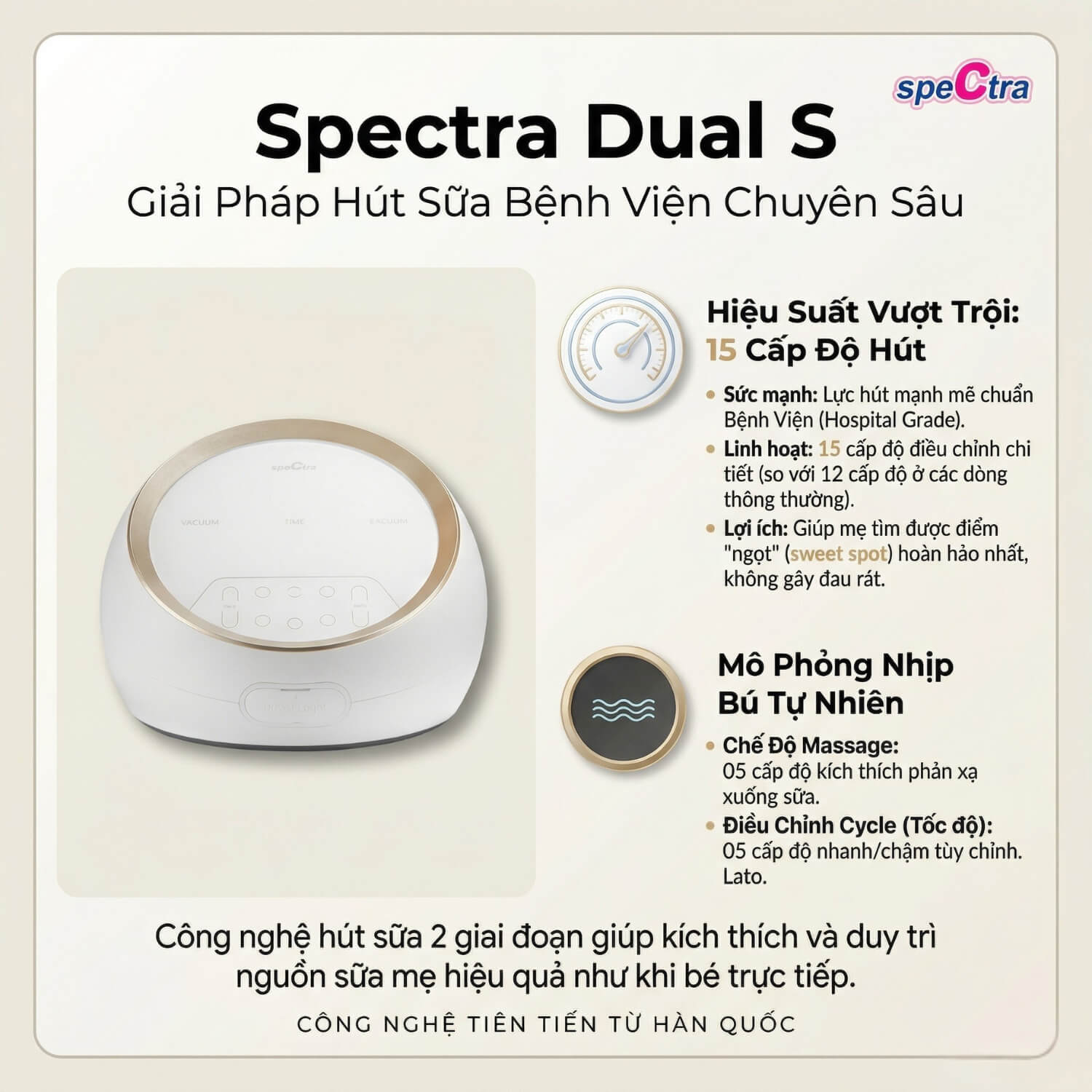 Máy hút sữa Spectra Dual S là dòng máy hút sữa điện đôi kép cấp bệnh viện của thương hiệu Spectra Hàn Quốc — điểm khác biệt cốt lõi so với các máy hút đôi thông thường nằm ở chỗ: Dual S sở hữu hai động cơ hoàn toàn độc lập, không phải một động cơ chia đôi lưu lượng. Điều đó có nghĩa là mẹ có thể cài đặt mức hút và chu kỳ hút khác nhau cho từng bên ngực mà hai bên không ảnh hưởng lẫn nhau.