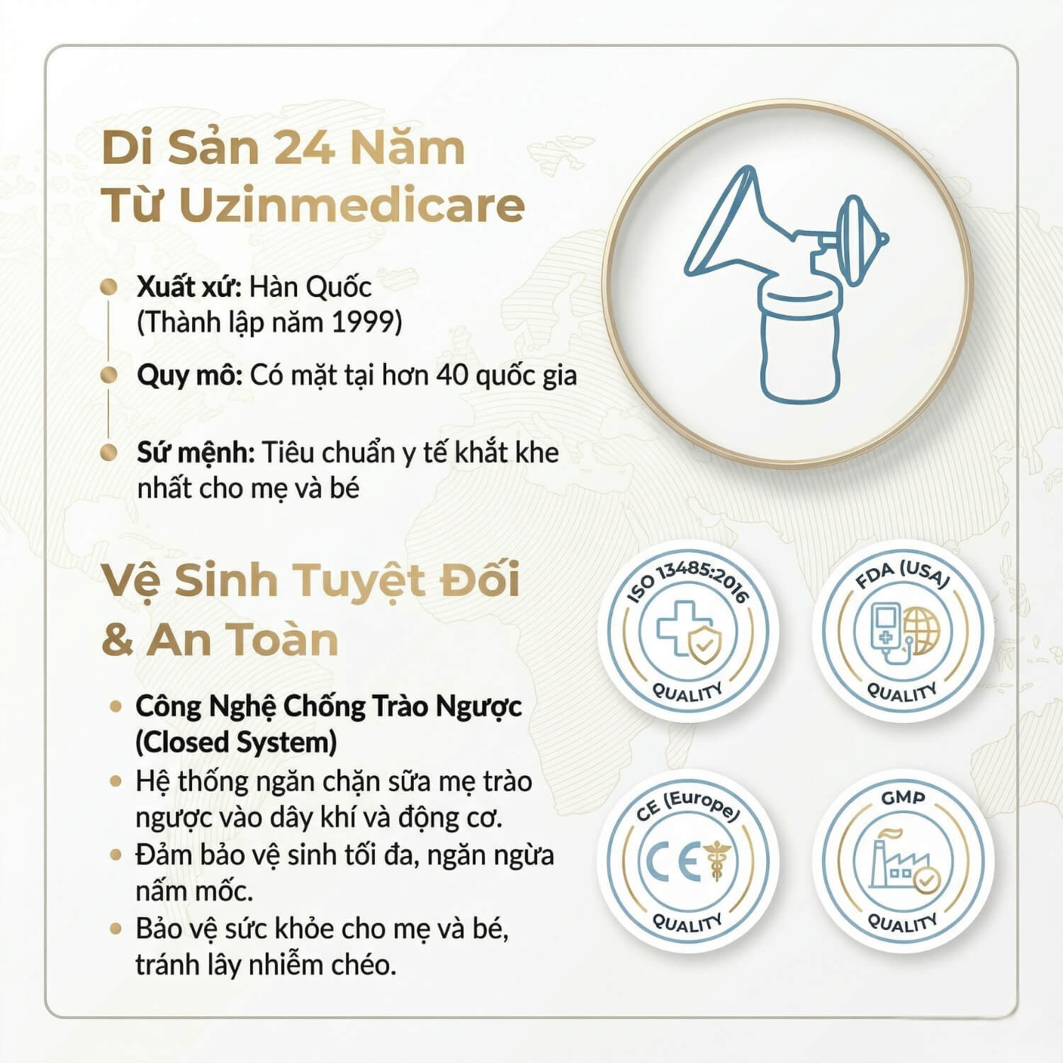 Hệ thống khép kín với backflow protector ngăn sữa chảy ngược vào động cơ — đây là yếu tố vệ sinh quan trọng mà nhiều mẹ hay bỏ qua khi chọn máy. Máy tự động tắt sau 30 phút để bảo vệ mô vú, và toàn bộ phụ kiện tiếp xúc sữa đều làm từ nhựa BPA-free.