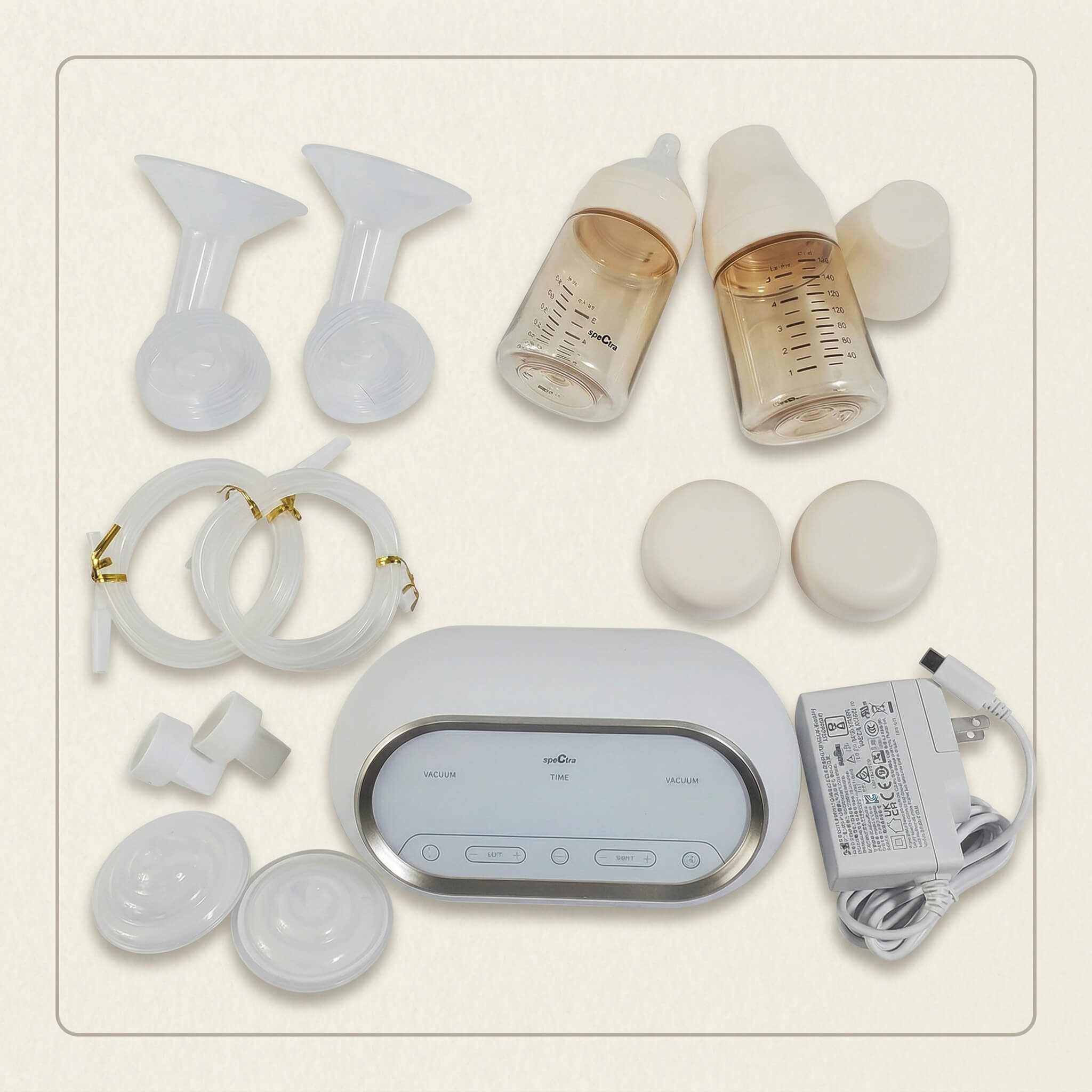 Mỗi hộp máy Spectra Dual Compact được trang bị đầy đủ các phụ kiện đạt chuẩn y tế, giúp mẹ bắt đầu hành trình nuôi con bằng sữa mẹ một cách thong dong nhất: