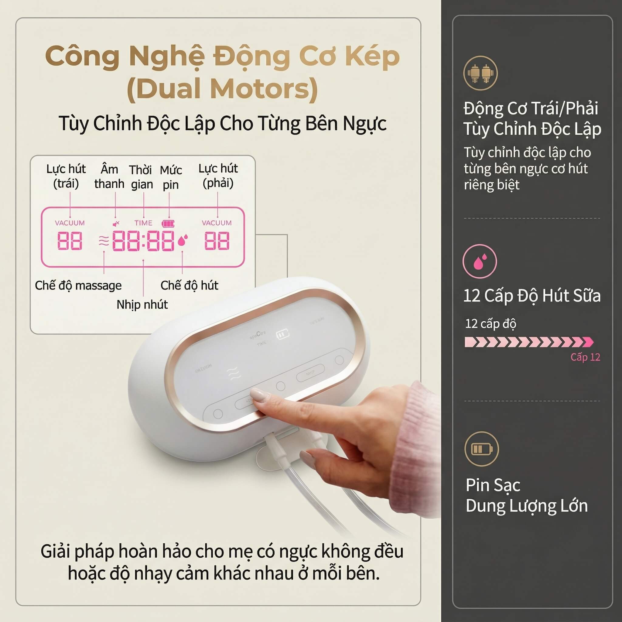 Động cơ đôi độc lập: Đây là sự kết hợp hoàn hảo giữa tính di động (Portable) và sức mạnh của dòng Dual cao cấp. Bạn có thể chỉnh lực hút bên trái mạnh, bên phải nhẹ — giải pháp tối ưu cho những mẹ gặp tình trạng ngực bên to bên nhỏ hoặc tiết sữa không đều.