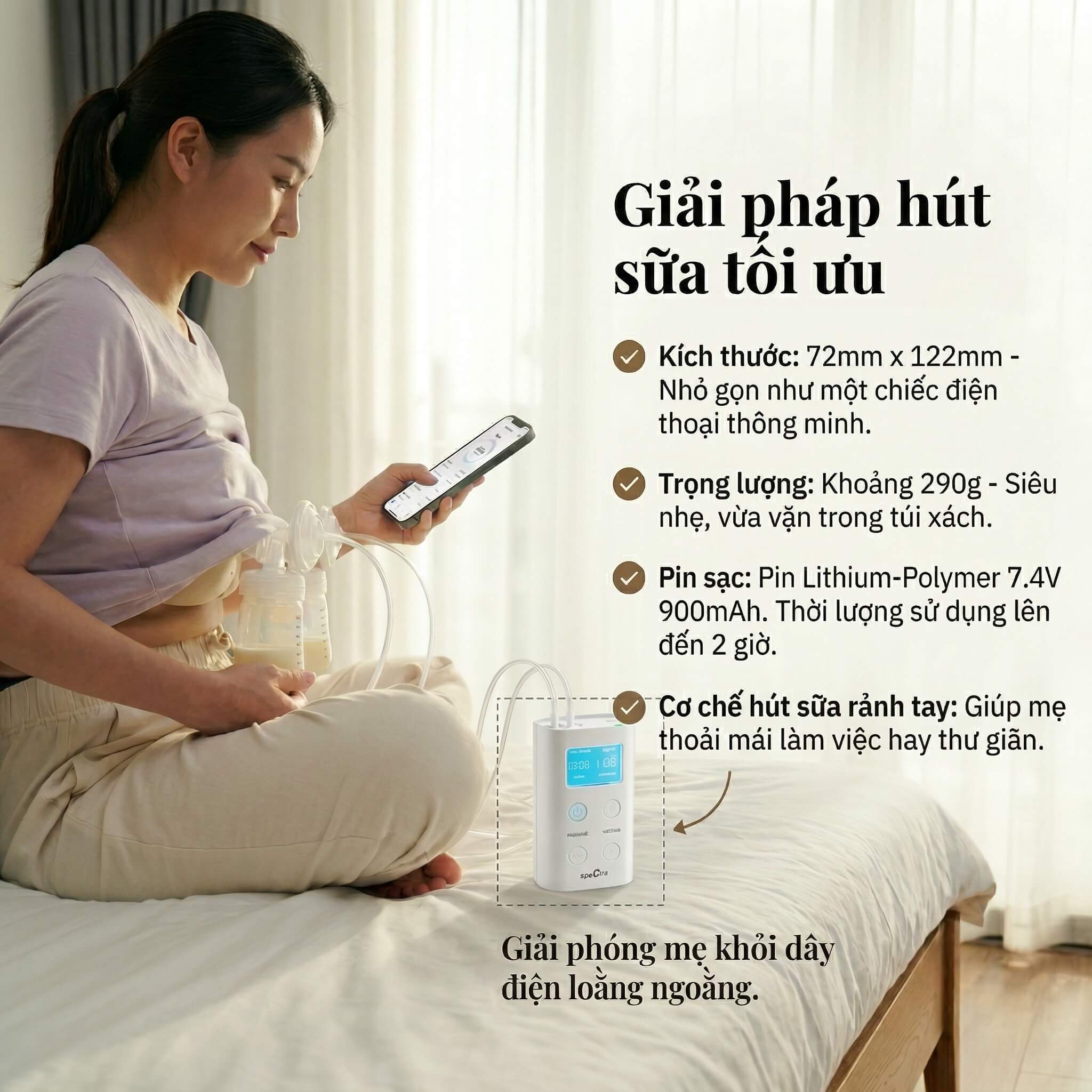 Đây là điều mẹ có thể yên tâm. Với kích thước chỉ bằng chiếc điện thoại và trọng lượng dưới 300g, S9 Plus lọt vừa vào hầu hết túi xách công sở. Vận hành dưới 60 dB nghĩa là mẹ có thể hút sữa kín đáo trong phòng riêng mà không lo tiếng ồn. Pin sạc đủ dùng cho cả ngày làm việc nếu mẹ sạc đầy từ tối hôm trước. Nhiều mẹ chia sẻ rằng đây là chiếc máy đầu tiên giúp họ duy trì việc hút sữa đều đặn sau khi đi làm lại.