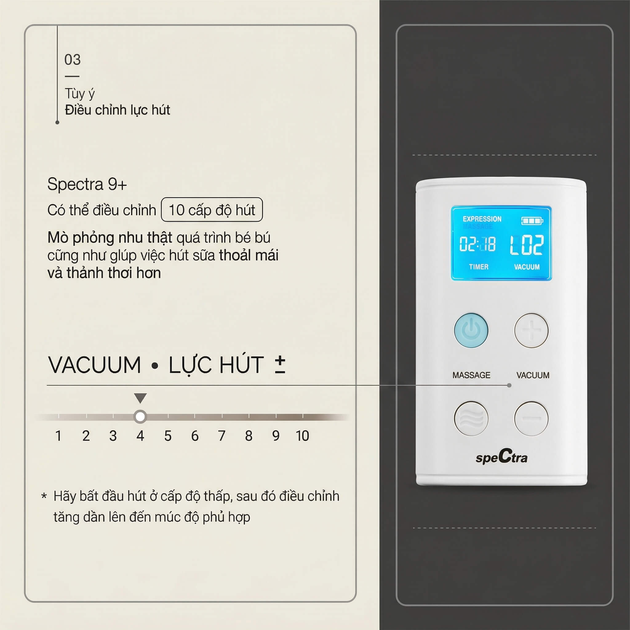 Nhấn lại nút gợn sóng để biểu tượng "giọt sữa" hiện ra. Spectra 9 Plus sở hữu 10 cấp độ hút chân không êm ái.