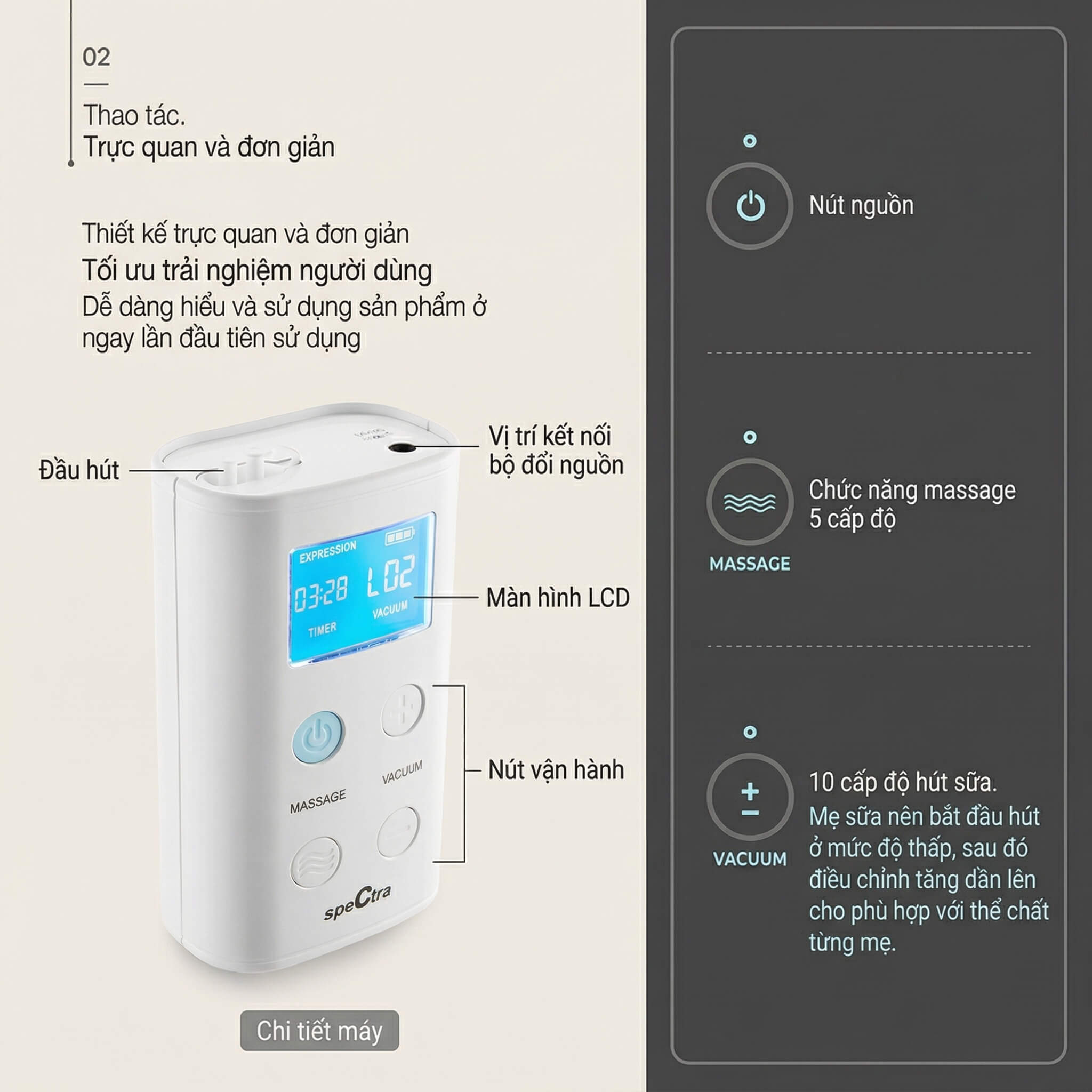 Điểm khác biệt cốt lõi so với các máy để bàn là pin lithium-polymer tích hợp và trọng lượng chỉ khoảng 290g — nhỏ gọn như một chiếc điện thoại smartphone. Spectra 9 Plus Hàn Quốc đạt chứng chỉ quốc tế FDA (Hoa Kỳ), CE (Châu Âu) và ISO 13485, đảm bảo tiêu chuẩn an toàn y tế nghiêm ngặt cho cả mẹ và bé.