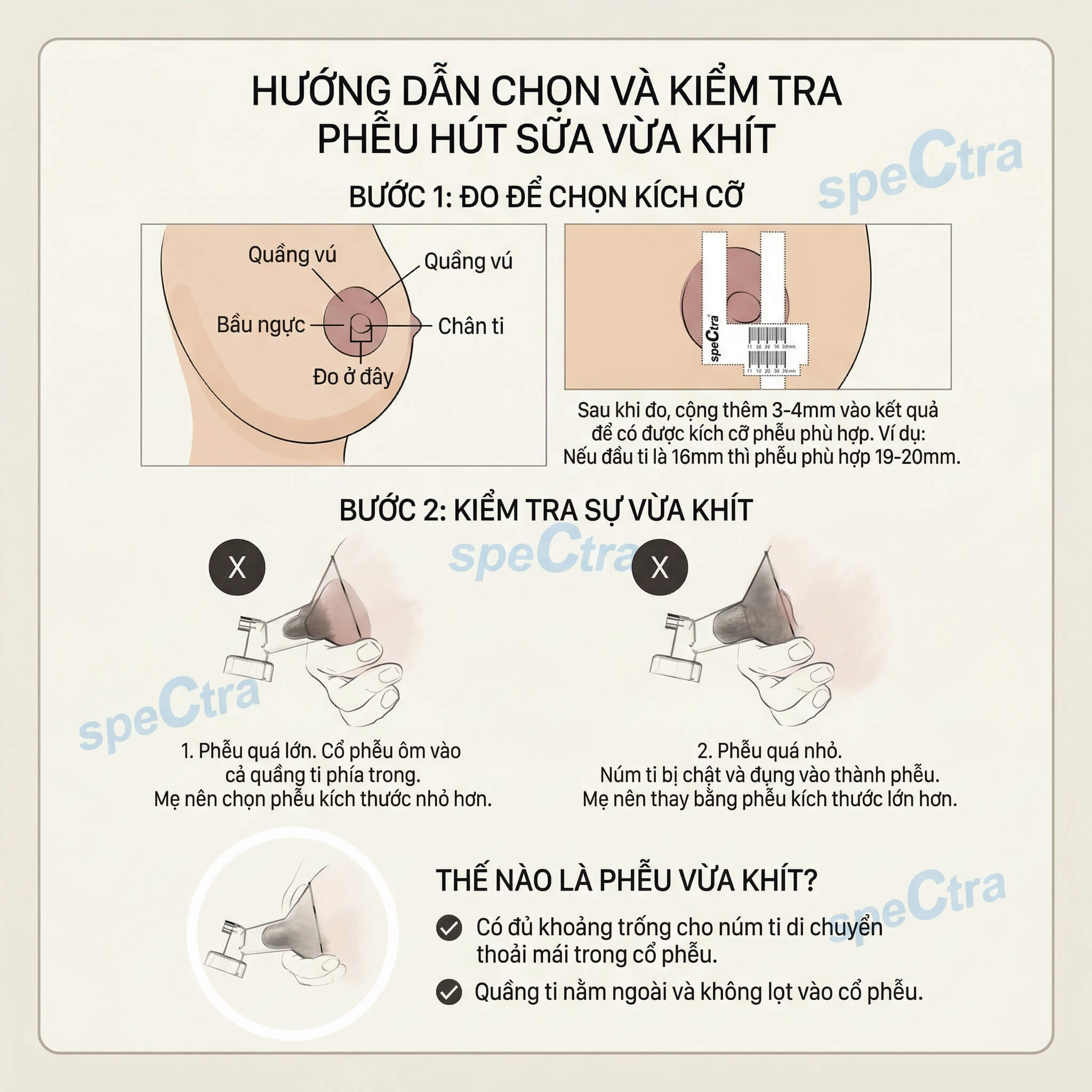 Size phễu: Phải lớn hơn núm ti từ 3–4 mm. Nếu phễu quá chật sẽ gây đau, quá rộng sẽ giảm áp lực hút.