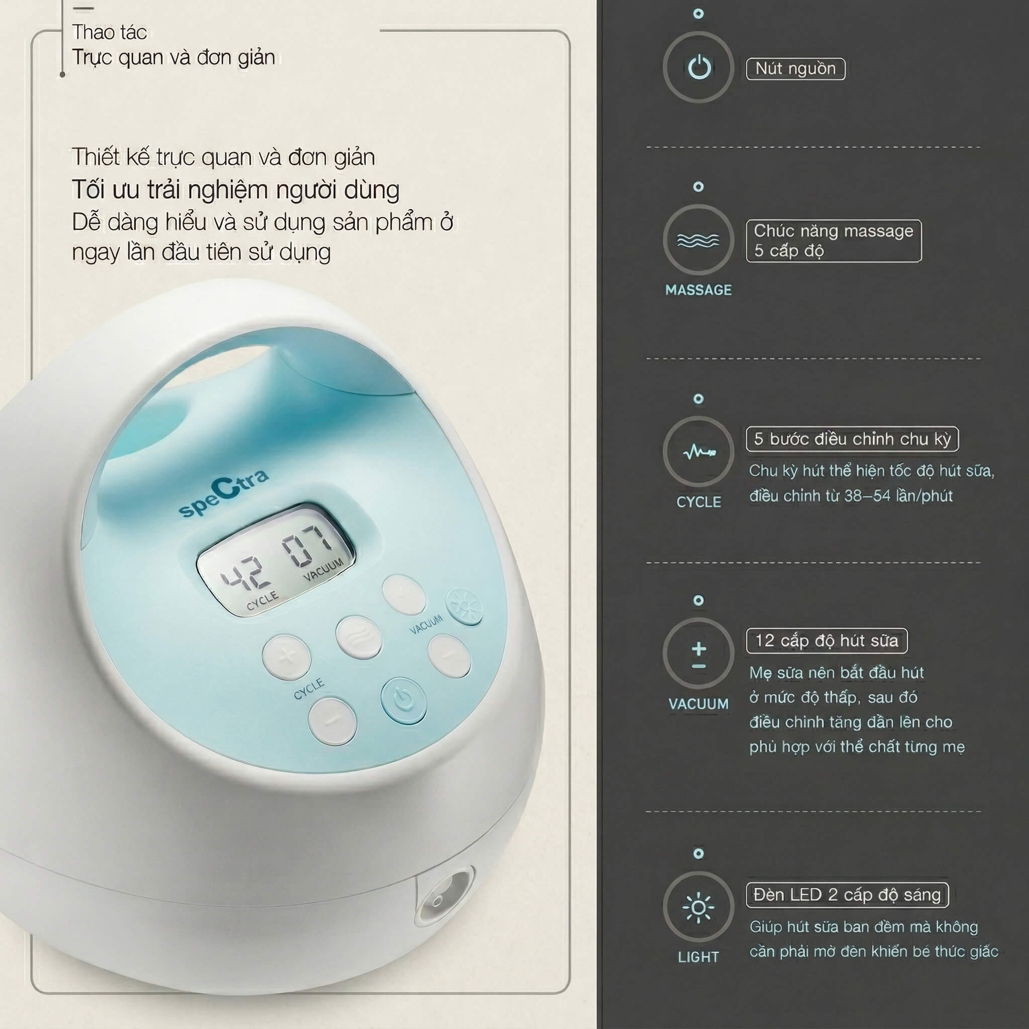 Điều mình thích ở Spectra S1+ là thiết kế tính năng hướng đến trải nghiệm thực tế của mẹ — không chỉ đẹp trên thông số kỹ thuật mà còn dễ dùng trong cuộc sống hàng ngày.