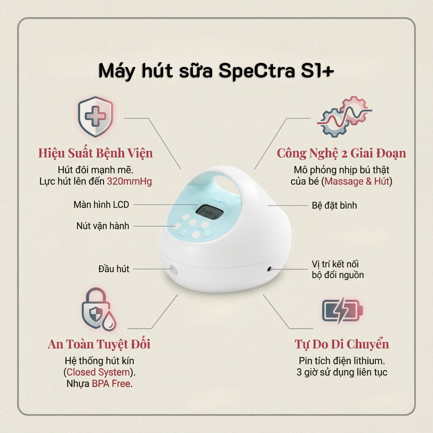 Dưới đây là phần trình bày chi tiết về thông số kỹ thuật và danh mục phụ kiện của Spectra S1 Plus — "người anh cả" lừng danh trong dòng máy hút sữa chuẩn bệnh viện.