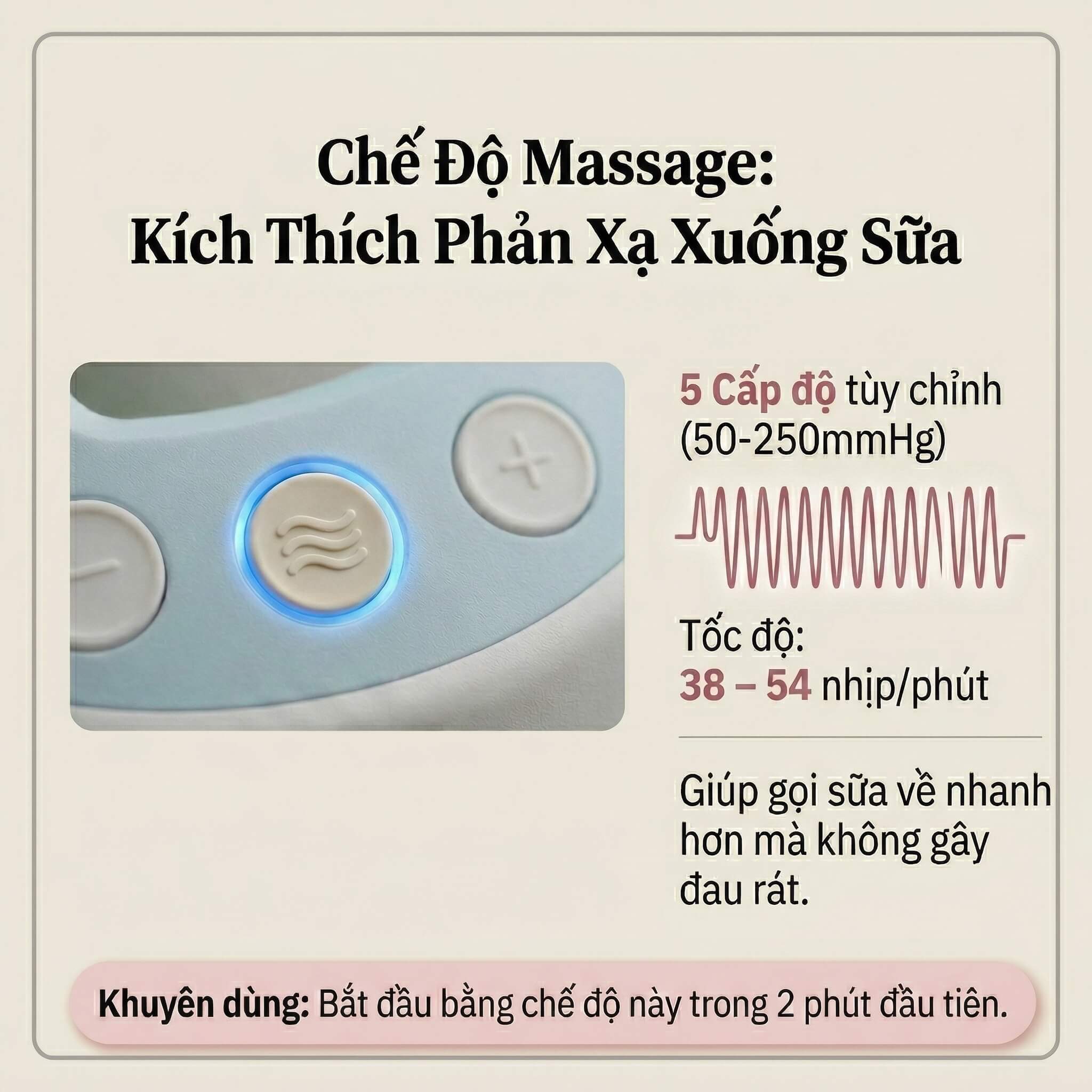 Duy trì tối đa 2 phút hoặc đến khi thấy sữa bắt đầu chảy thì chuyển sang chế độ hút.