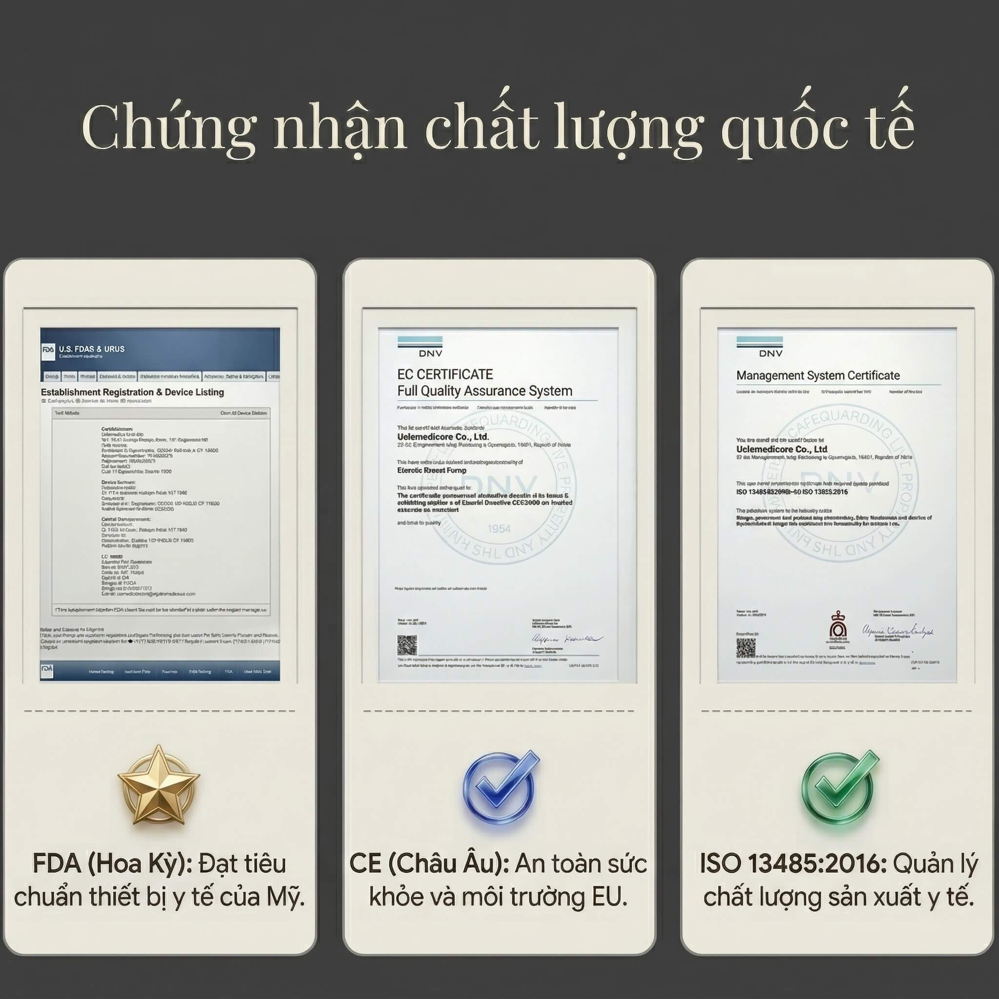 FDA (Hoa Kỳ) & CE (Châu Âu): Vượt qua những bài kiểm tra khắt khe nhất về an toàn thiết bị y tế.