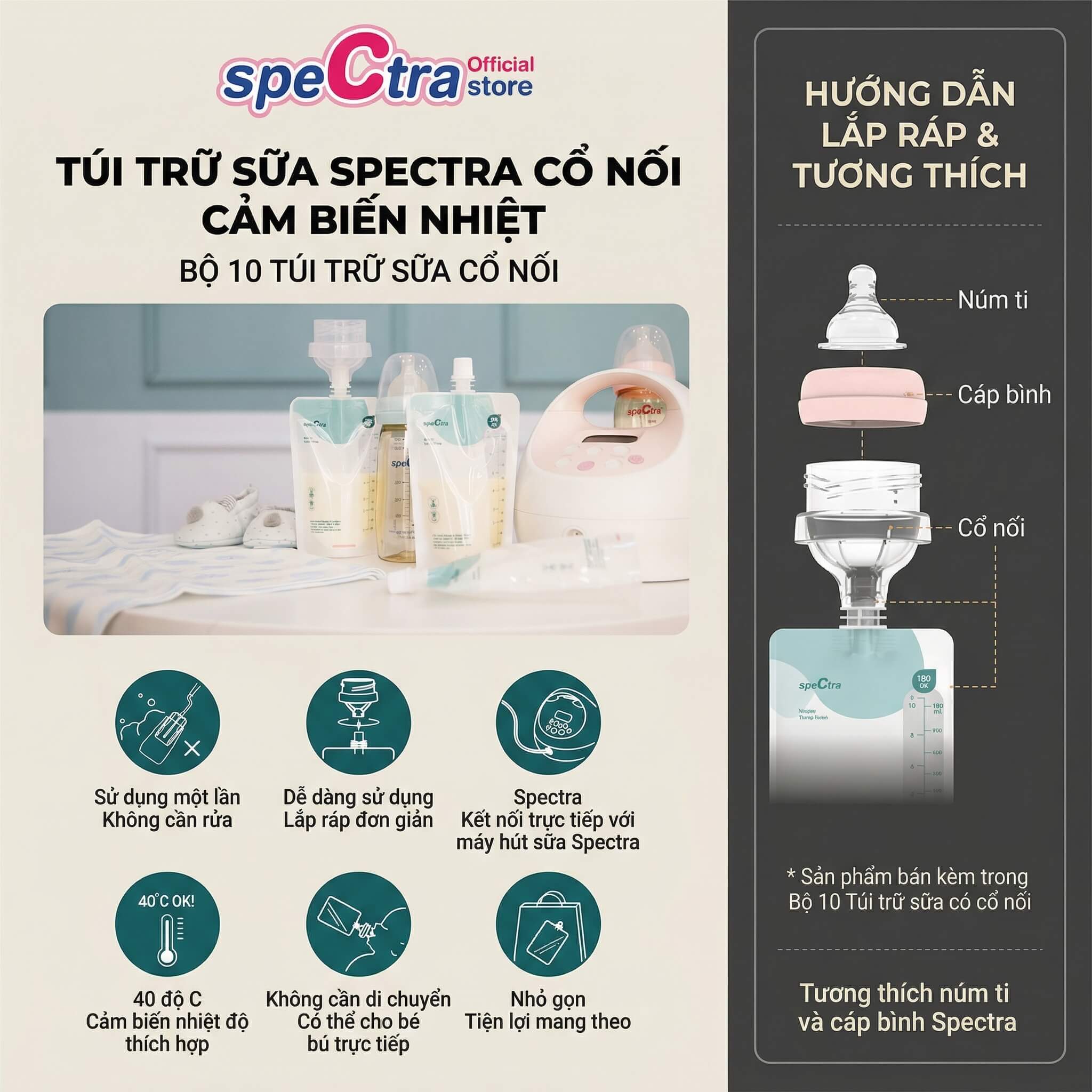 Ngoài ra, backflow protector — hệ thống chặn sữa trào ngược — đảm bảo sữa không chảy vào dây khí và động cơ, bảo vệ cả máy lẫn chất lượng sữa. Tất cả phụ kiện tiếp xúc sữa đều đạt chuẩn BPA-free, an toàn cho bé từ những giọt sữa đầu tiên. Đây là Spectra Dual Compact chính hãng đạt chứng nhận FDA và CE — bạn hoàn toàn có thể yên tâm về tiêu chuẩn an toàn.